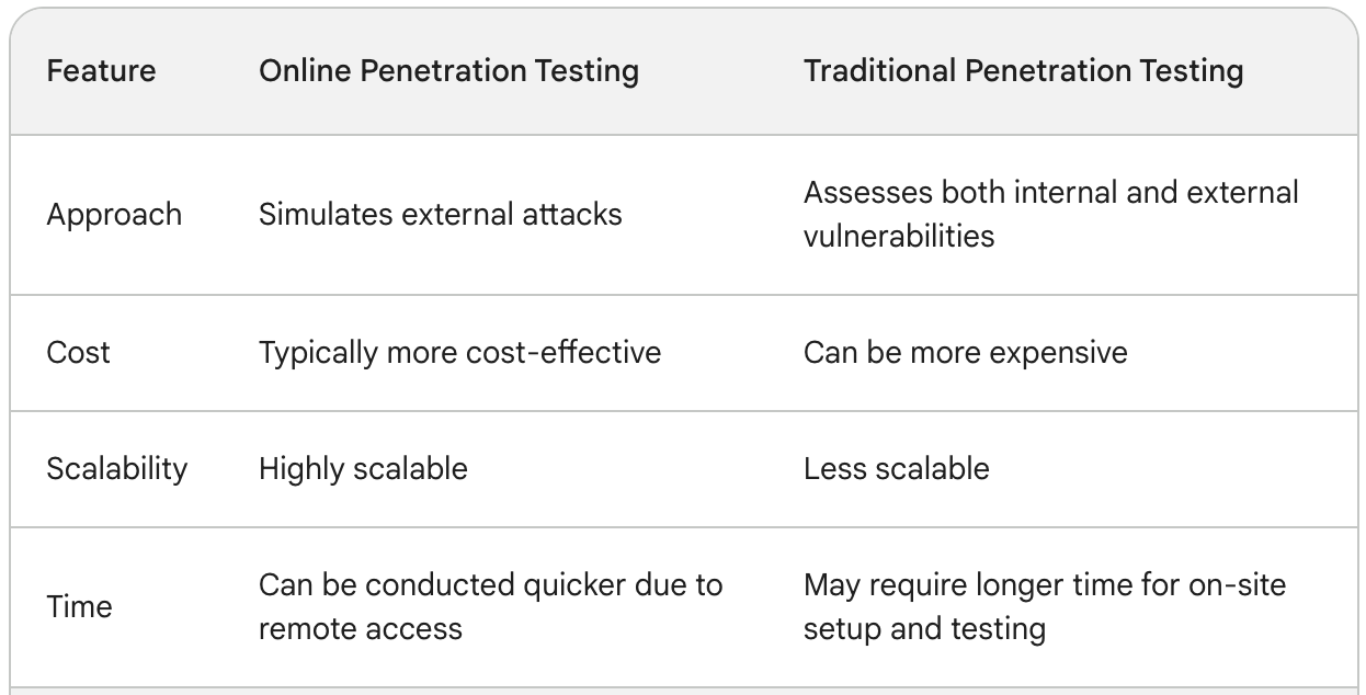 Both online and traditional penetration testing offers valuable tools for securing your organization's digital assets. Selecting the most appropriate method hinges on your specific needs, considering factors like budget, scalability, and the scope of the security assessment required.